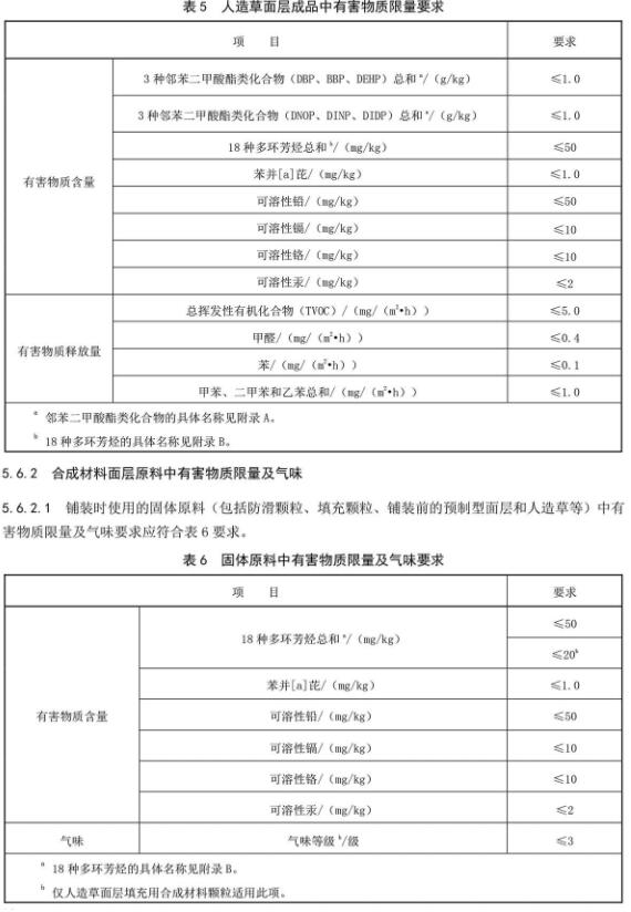現(xiàn)澆型和預制型面層成品中有害物質限量及氣味應符合表? 4? 要求,人造草面層成品中有害物質限量應符合表? 5? 要求。