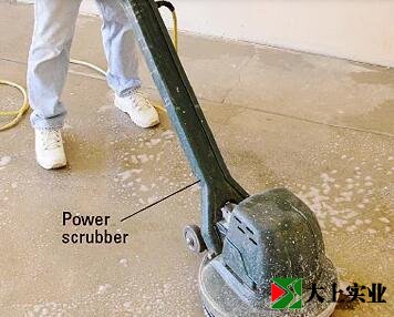 用水弄濕整個(gè)地板,使用濕磨機(jī)打磨整個(gè)地板。使用硬毛刷擦洗機(jī)器無法觸及的角落和墻壁。
