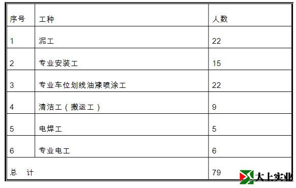 3、根據(jù)本工程實(shí)際情況,按照專(zhuān)業(yè)、高效選擇施工隊(duì)伍參與工程施工原則,整個(gè)工程擬安排車(chē)庫(kù)地坪、標(biāo)志、標(biāo)牌、標(biāo)線、設(shè)備安裝、綜合專(zhuān)業(yè)施工隊(duì)共六個(gè)。各專(zhuān)業(yè)施工隊(duì)按照