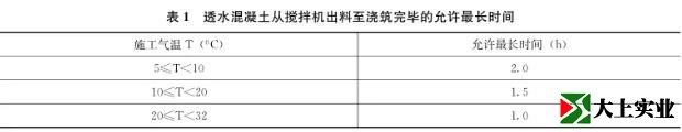 (6)透水水泥混凝土拌合物從攪拌機(jī)出料后,運(yùn)至施工地點(diǎn)進(jìn)行攤鋪、壓實(shí)直至澆筑完畢的允許最長(zhǎng)時(shí)間,可由實(shí)驗(yàn)室根據(jù)水泥初凝時(shí)間及施工氣溫確定,并應(yīng)符合表1的規(guī)定。