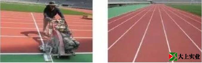 按照國際田聯IAAF《田徑場地設施標準手冊》2008版標準進行劃線,采用全站儀進行放線操作,盡量使用白灰線盒,避免使用黑色線盒。由專業劃線師完成大面積的劃線。接頭以及數字部分由助手使用數字模具噴涂而成。使用的面漆盡量要求是聚氨酯耐黃變面漆,該材料具有較好的伸長率,與下面的顆粒粘接良好,不容易脫落與黃變褪色。