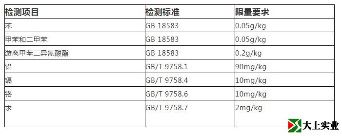 在我國強制性國家標準GB 18581一2001及GB 18583—2001《室內(nèi)建筑裝飾裝修材料有害物質(zhì)限量》系列標準中對聚氨酯類裝修材料中所含TDI的量分別進行了規(guī)定,要求小于0.7%和小于1%。此外我國化工行業(yè)標準HG/T 3608—1999聚酯聚氨酯木器涂料(Polyester Polyurethane coatings for woodenware) 中也規(guī)定了以TDI及多元醇和多元酸的反應產(chǎn)物為基料生產(chǎn)的清漆、有色透明漆和瓷漆中的游離TDI含量。