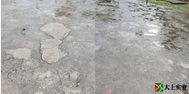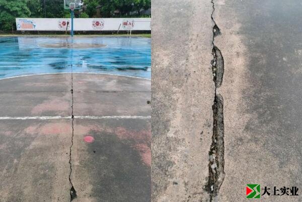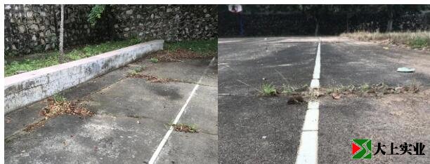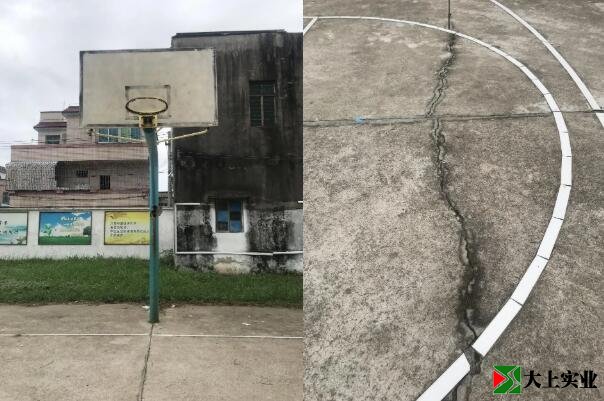 由于球場地基下沉、年久失修,地面多處開裂且凹凸不平。學生活動時要小心翼翼,存在著較大的安全隱患。