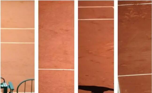 在同一片場地上,在晴朗、干燥的天氣下打球,球落地后球速相對快且彈跳高;在多云、潮濕的天氣中,球落地后的速度相對慢且彈跳低。在不同光照強度下,紅土場地會在照片中呈現不同色彩。