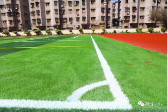 人造草足球場、2個跳遠區及其他附屬設施組成。各活動功能區域劃分科學,整個運動場色澤鮮艷、平整劃一,面層厚薄均勻,具有良好的彈性和防滑性,為師生提供了安全、舒適的運動健身環境。運動場的改造成功,將為荷城一小陽光體育活動開展提供了極大的便利,是學校發展的又一大盛事。鮮紅的跑道,翠綠的足球場,將成為同學們健身休閑的樂園,校園一道亮麗的風景線。同學們可以在新跑道上暢快奔跑,享受塑膠跑道“舒適性高、彈性好”的運動體驗。