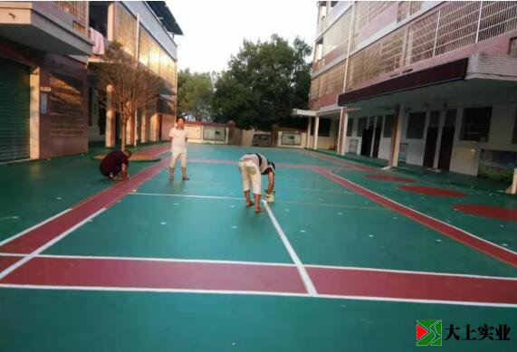 從10月1號勘察場地開始動工到完工結(jié)束,整個工程,建筑工人共花10天左右時間。首先本項(xiàng)目的工程師傅對操場的水泥地面進(jìn)行了打磨、清洗、伸縮縫的處理;然后5次對場地涂刮硅PU膠,包括場地補(bǔ)平、底層、彈性層、加強(qiáng)層、面層的刮膠處理;最后在場地表面劃彩線,迅速把操場布置成一個標(biāo)準(zhǔn)漂亮的排球場和羽毛球場,連學(xué)生做操的站立位置也一一標(biāo)明。