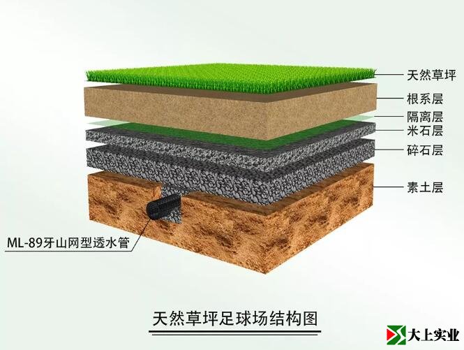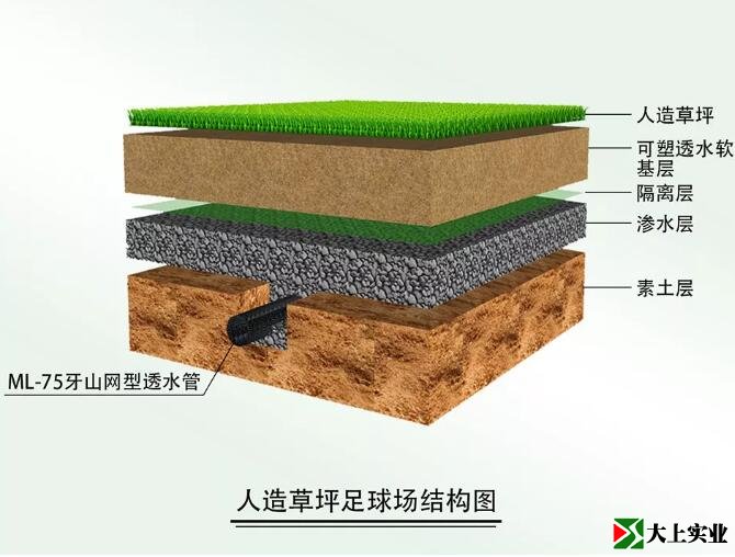 基于環境保護和運動安全考慮,大上實業總結了天然草坪及棒球場紅土層做法,發明了一種可塑透水軟基礎結構及施工方法,該可塑透水軟基礎透水性好(無積水現象)、可塑性好(平整度容易控制)、硬度適中(接近天然草坪足球場硬度)。同時,若想把人造草坪改成天然草坪,只需清除掉人造草坪面層,對原有基礎簡單處理,便可直接種植天然草坪,實現了人造草坪和天然草坪之間的自由切換,簡單、方便、耗資少。