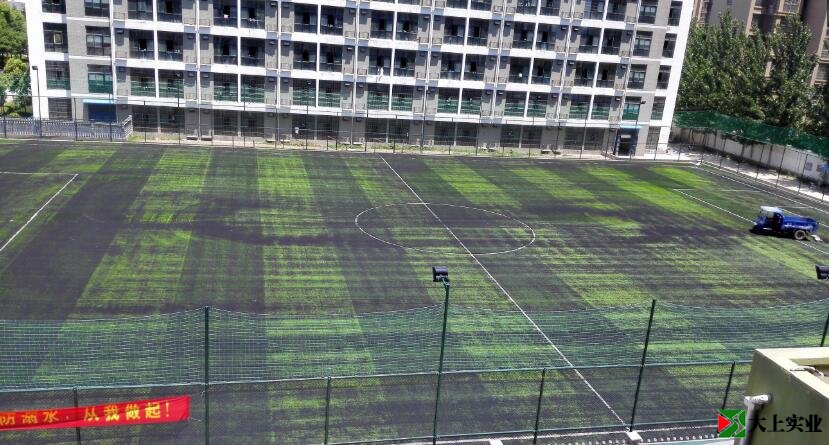 人工草皮都在鋪設了呢!場上是三輪車拖著橡膠顆粒包裝袋在撤橡膠顆粒。